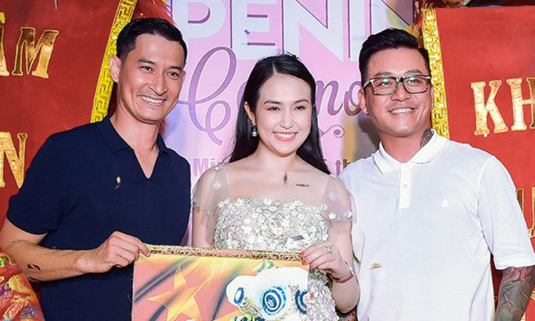 Tuấn Hùng và vợ (phải) chúc mừng Huy Khánh (trái) về một doanh nghiệp thịnh vượng. Nhiếp ảnh: Đăng Chuc.