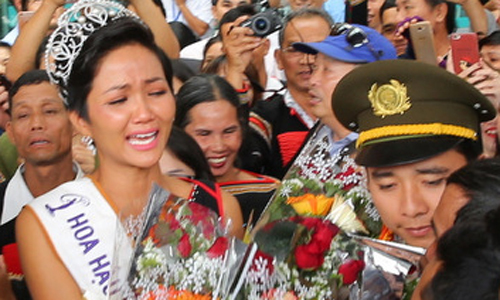 Một số lượng lớn người từ Ed chào đón người phụ nữ ở sân bay Buôn Ma Thuột. Họ giơ biểu ngữ và tiếp tục la hét cô ấy Tên, khi cô gái quê này giành được danh hiệu Hoa hậu Hoàn vũ Việt Nam, họ đã chia sẻ niềm vui và niềm tự hào. 2017 .