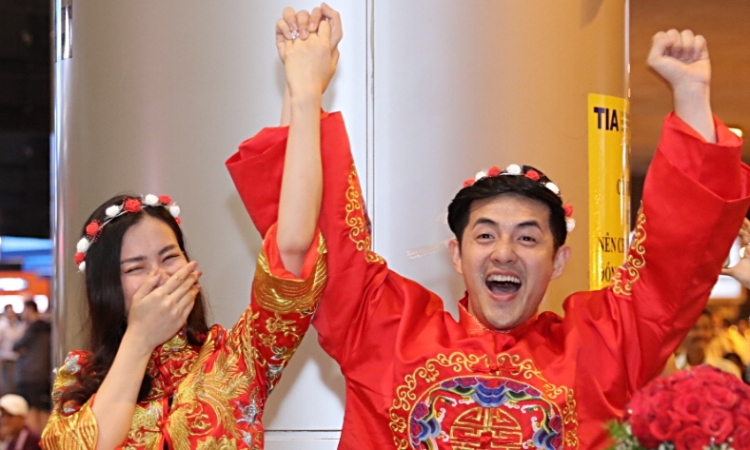 Cặp đôi xúc động trước món quà do người hâm mộ chuẩn bị.