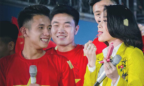 Trong lễ kỷ niệm được tổ chức tại Hà Nội, các cầu thủ và ca sĩ Hongdu đã chụp một bức ảnh của bộ đôi này. Những người chơi khác hát ở hàng sau. Mỹ Tâm thường treo trên vai Hồng Duy để giải tỏa căng thẳng. Nhiếp ảnh: Hoa Phạm .