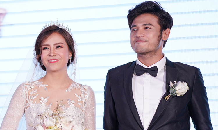 Cô dâu lúng túng bước lên sân khấu dưới tiếng vỗ tay của khách.