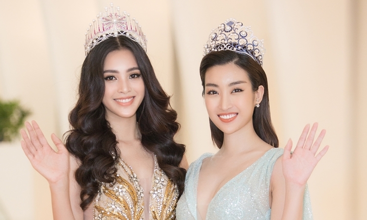 Tieu Vy (trái) và váy Đỗ Mỹ Linh tham gia cuộc thi.