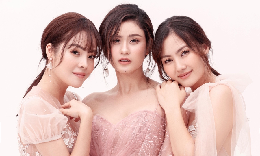 — Truong Quỳnh Anh, Ngọc Lan (trái sang phải) và Dương Cam Lynh mặc váy của nhà thiết kế Lâm Lâm trong.