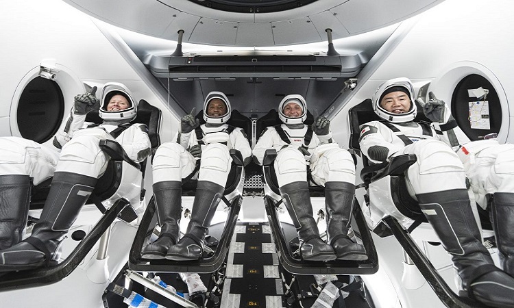 Từ trái qua phải, các phi hành gia Shannon Walker, Victor Glover, Michael Hopkins và Soichi Noguchi trong khoang rồng của phi hành đoàn. Ảnh: Space.