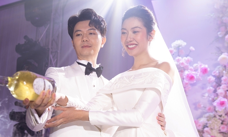 Phần chân váy xẻ cao, phần dưới xòe rộng giúp cô dâu khéo léo giấu bụng bầu, đồng thời tôn lên khoảnh khắc trên sân khấu lễ sóng.