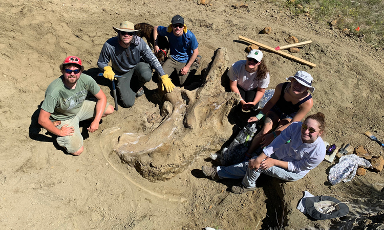 Nhóm tạo dáng với hộp sọ khủng long. David Schmidt, giáo sư khoa học môi trường và địa chất tại Westminster College, cho biết: “Điều này thật thú vị. Chúng tôi không thể tin được.” Ông đã dẫn đầu một nhóm sinh viên và cựu sinh viên đến khai quật tại Vườn quốc gia Badlands ở Nam Dakota. Theo báo cáo từ USA Today ngày 26/8, thành quả của họ là một hóa thạch xương ba sừng nặng 1,4 tấn và dài 2,1 mét. ——Schmidt và các học sinh của ông thường chỉ tìm thấy những mảnh xương khủng long trong các cuộc khai quật hàng năm của họ. Do đó, kết quả của chuyến đi này thật tuyệt vời.